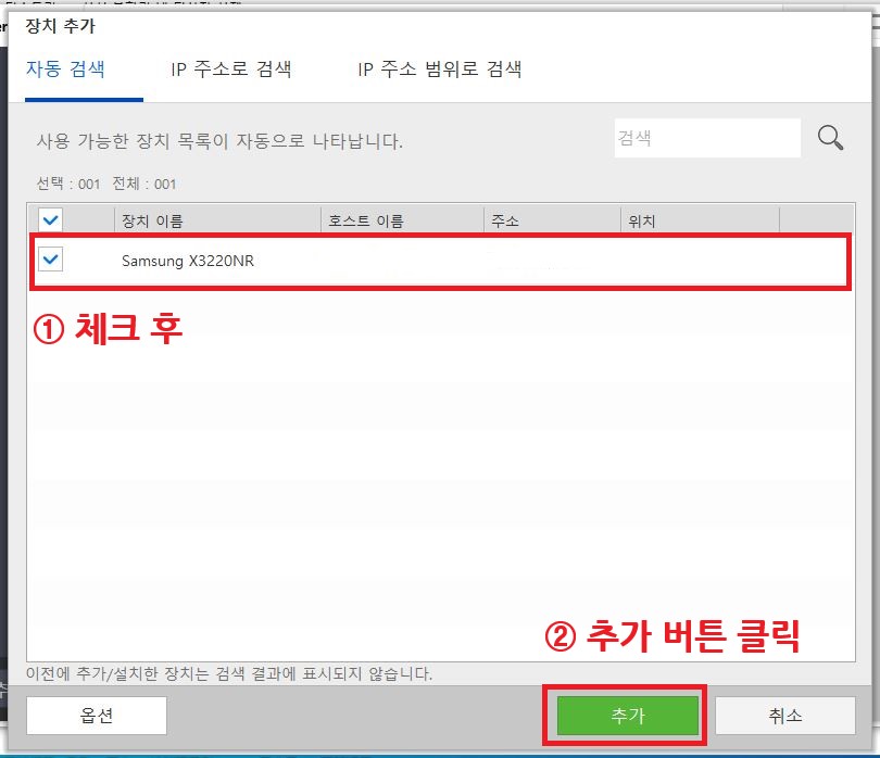 ▼⑨ 쓰고 계신 복합기를 찾으신 후 추가 버튼을 클릭하여 줍니다.