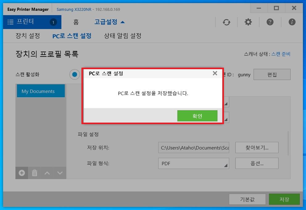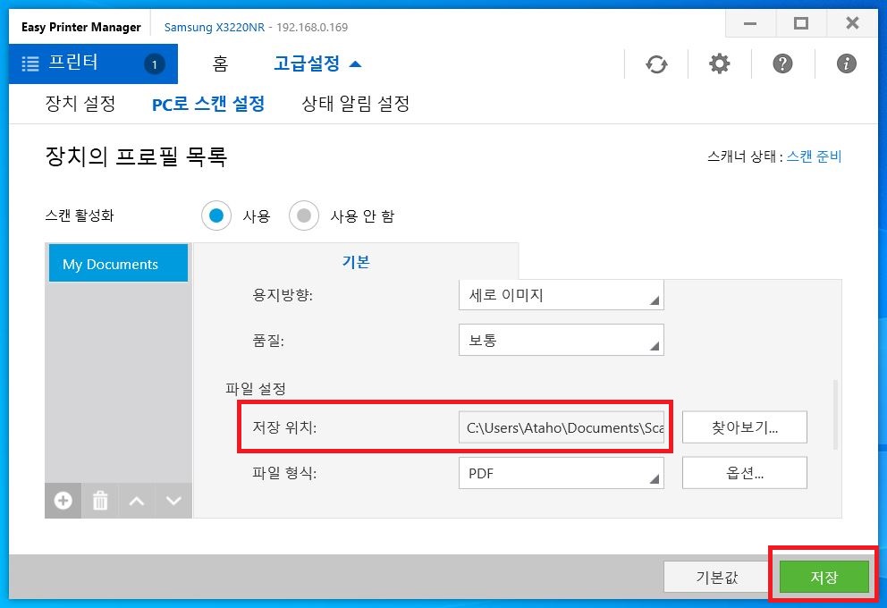 ▲10. 아래로 내려 스캔파일 저장위치 경로를 지정 한 후 저장을 클릭합니다.
